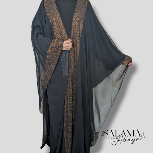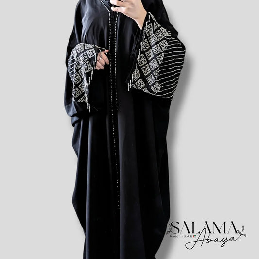 L'Abaya "Zukhruf Al-Layl" marie élégance intemporelle et sophistication moderne avec son noir profond et ses ornements délicats. Sa confection de haute qualité garantit un confort et un style inégalés, reflétant le luxe des tendances de Dubaï.